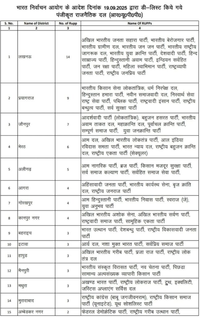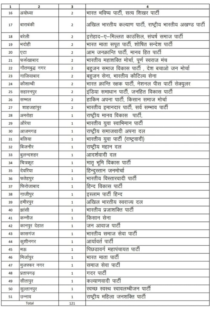 लखनऊ। उत्तर प्रदेश की राजनीति से जुड़ी बड़ी खबर सामने आई है। राज्य के मुख्य निर्वाचन अधिकारी नवदीप रिणवा ने प्रदेश के 121 पंजीकृत राजनीतिक दलों को सूची से हटा दिया है।