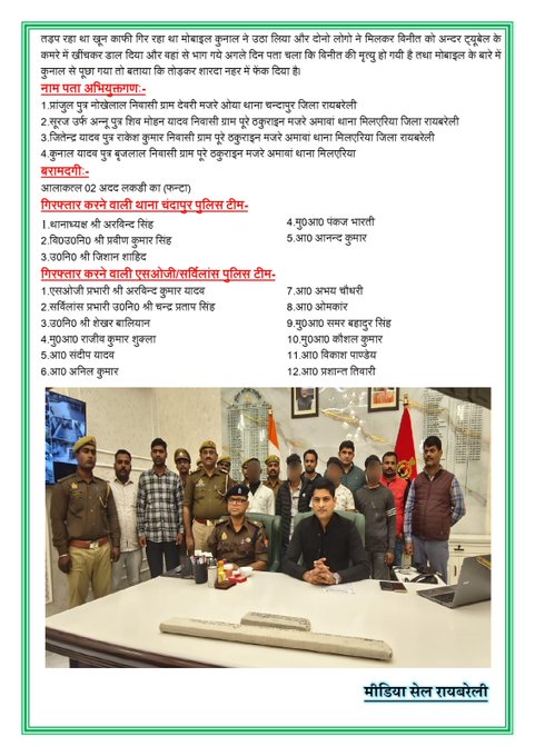 रायबरेली :जिले में चंदापुर थाना क्षेत्र में युवक की हत्या के मामले में पुलिस ने पर्दा उठा दिया है। जिस वारदात ने इलाके में दहशत फैला दी थी, उसके पीछे का कारण बेहद चौंकाने वाला निकला—गांजा पीते समय हुआ विवाद। एसओजी टीम और चंदापुर पुलिस की संयुक्त कार्रवाई में इस सनसनीखेज हत्या में शामिल चारों आरोपी गिरफ्तार कर लिए गए हैं।