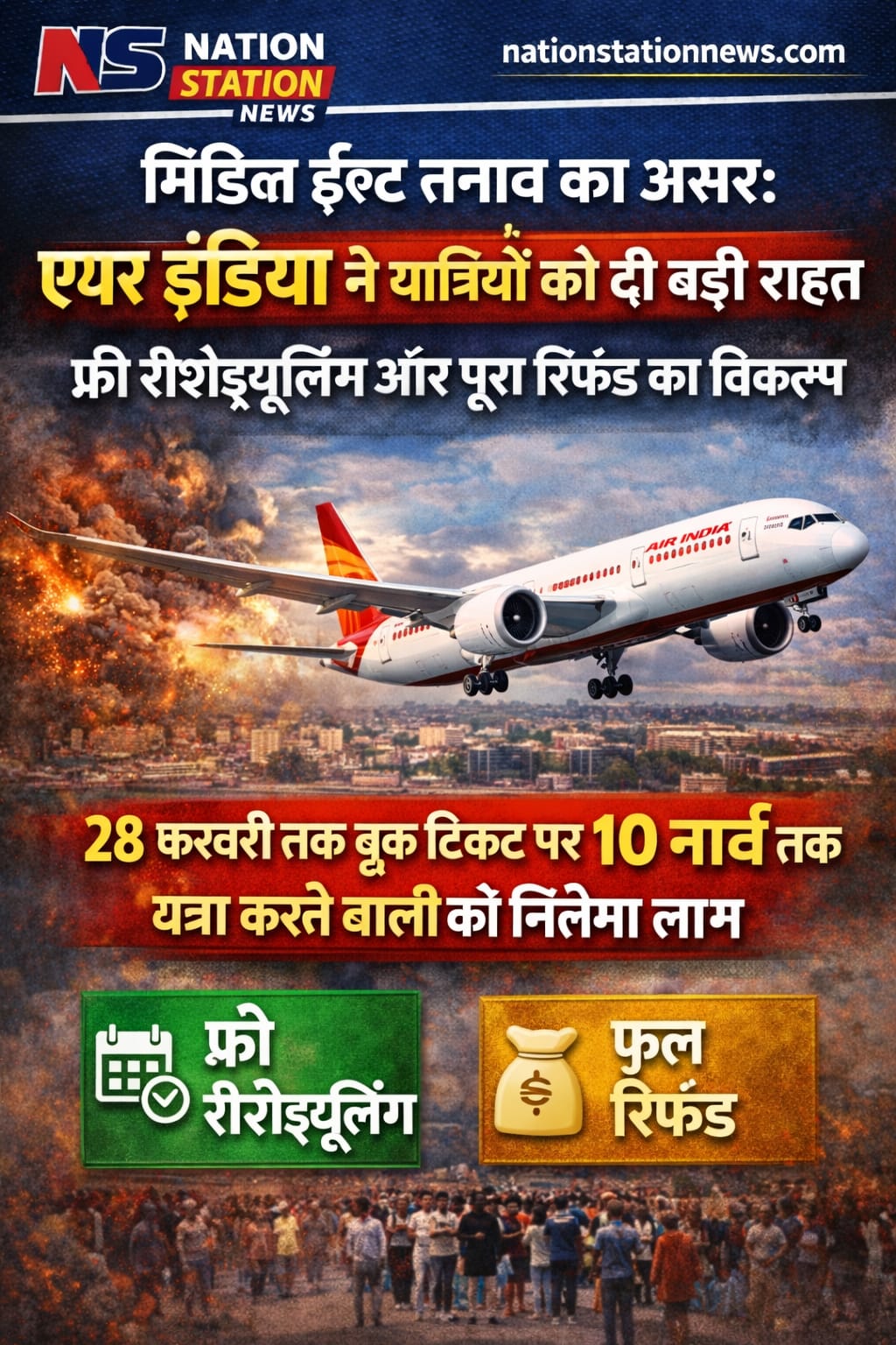 28 फरवरी तक बुक टिकट पर 10 मार्च तक यात्रा करने वालों को मिलेगा लाभ दिल्ली कूच की तैयारी में नीतीश! बिहार में नए सीएम को लेकर सियासी घमासान तेज नई दिल्ली। मिडिल ईस्ट में बिगड़ते हालात और उसके चलते उड़ानों के संचालन पर पड़ रहे असर को देखते हुए Air India ने अपने यात्रियों … Continue reading मिडिल ईस्ट तनाव का असर: एयर इंडिया ने यात्रियों को दी बड़ी राहत, फ्री रीशेड्यूलिंग और पूरा रिफंड का विकल्प